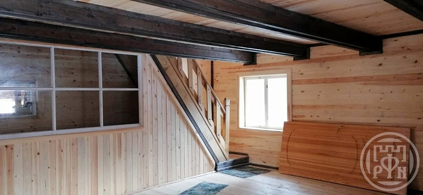 В доме на первом этаже находятся : кухня с верандой s 30 кв м (с колодцем и насосом для подачи технической воды), мастерская с деревообрабатывающим станком s18 кв м, баня с предбанником s 20 кв м, комната с гардеробной s 36 кв м, с высотой потолка 2,3м , в нём встроен проём для дымоходной трубы будущей печки.