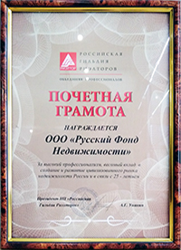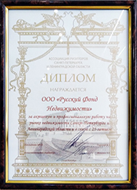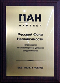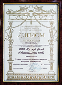 Компания "Русский Фонд Недвижимости" победила в номинации "Лучшая риэлторская компания на рынке загородной недвижимости". Подтверждением этого стало вручение Диплома и статуэтки Каиссы.