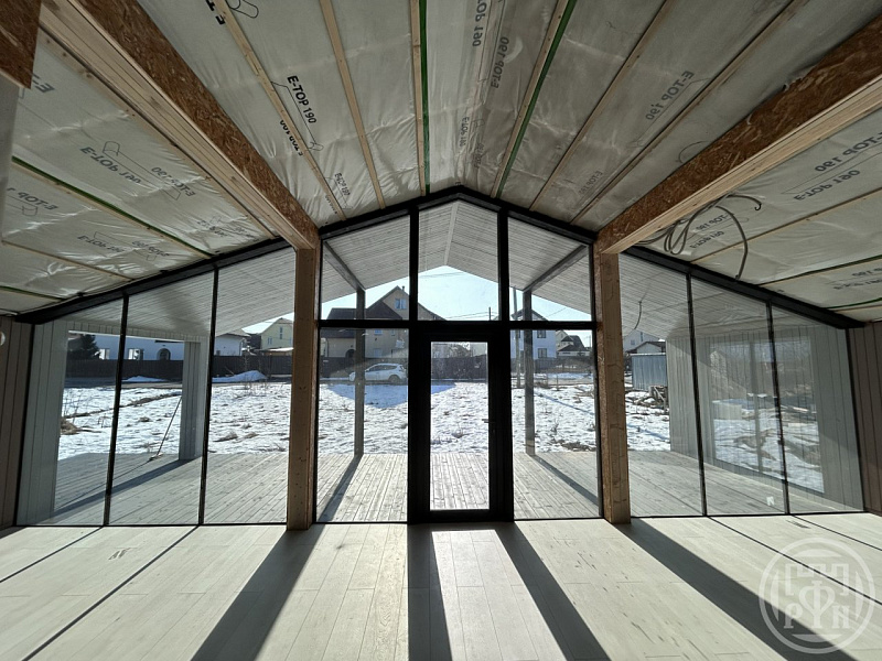 Особенностью этого дома являются панорамные окна, выходящие на все 4 стороны света. Это наполняет дом светом и свежим воздухом.
